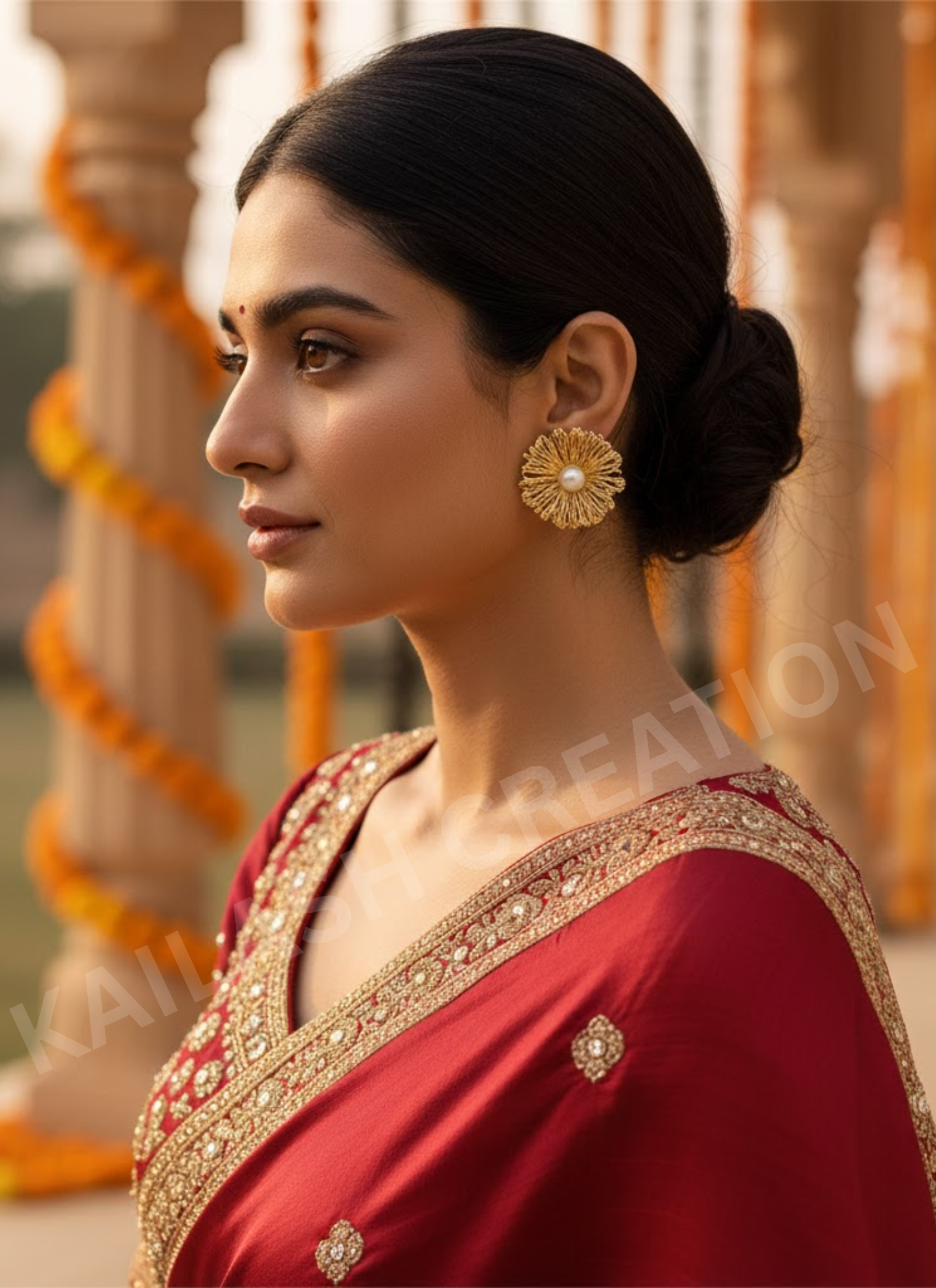 Kailash Creation Golden Bloom Pearl Stud Earrings