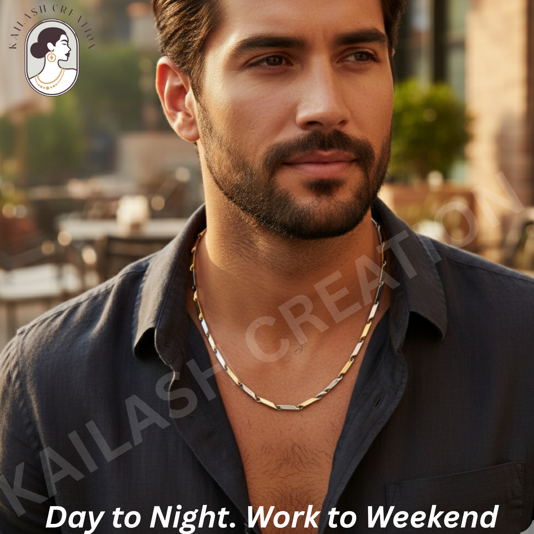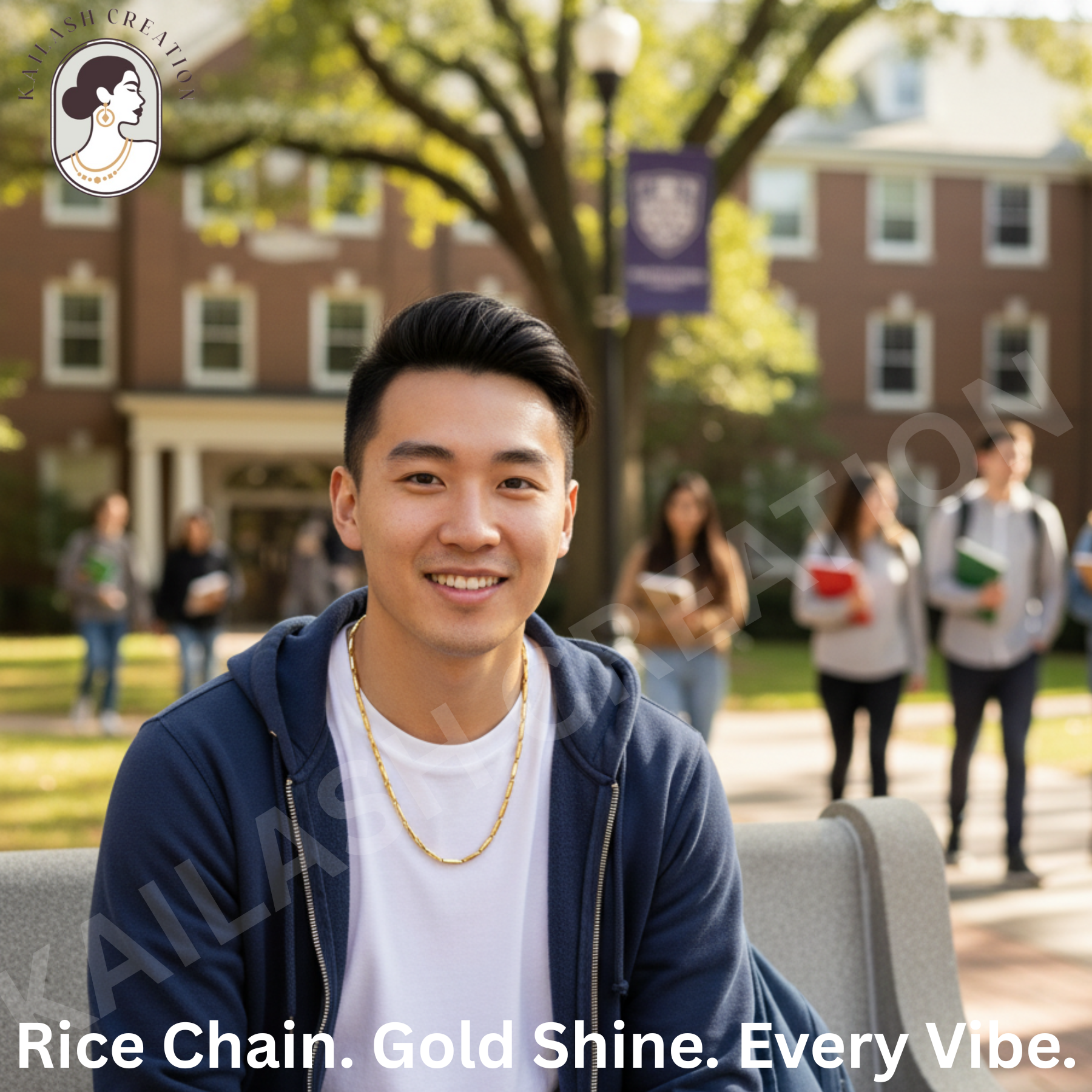 Experience premium elegance with the Kailash Creation 316L Stainless Steel Rice Chain, crafted for modern men and women who appreciate timeless style and unmatched durability. Designed with a sleek rice-link pattern and dual-tone finish, this chain seamlessly blends contemporary fashion with strong masculine and unisex appeal.