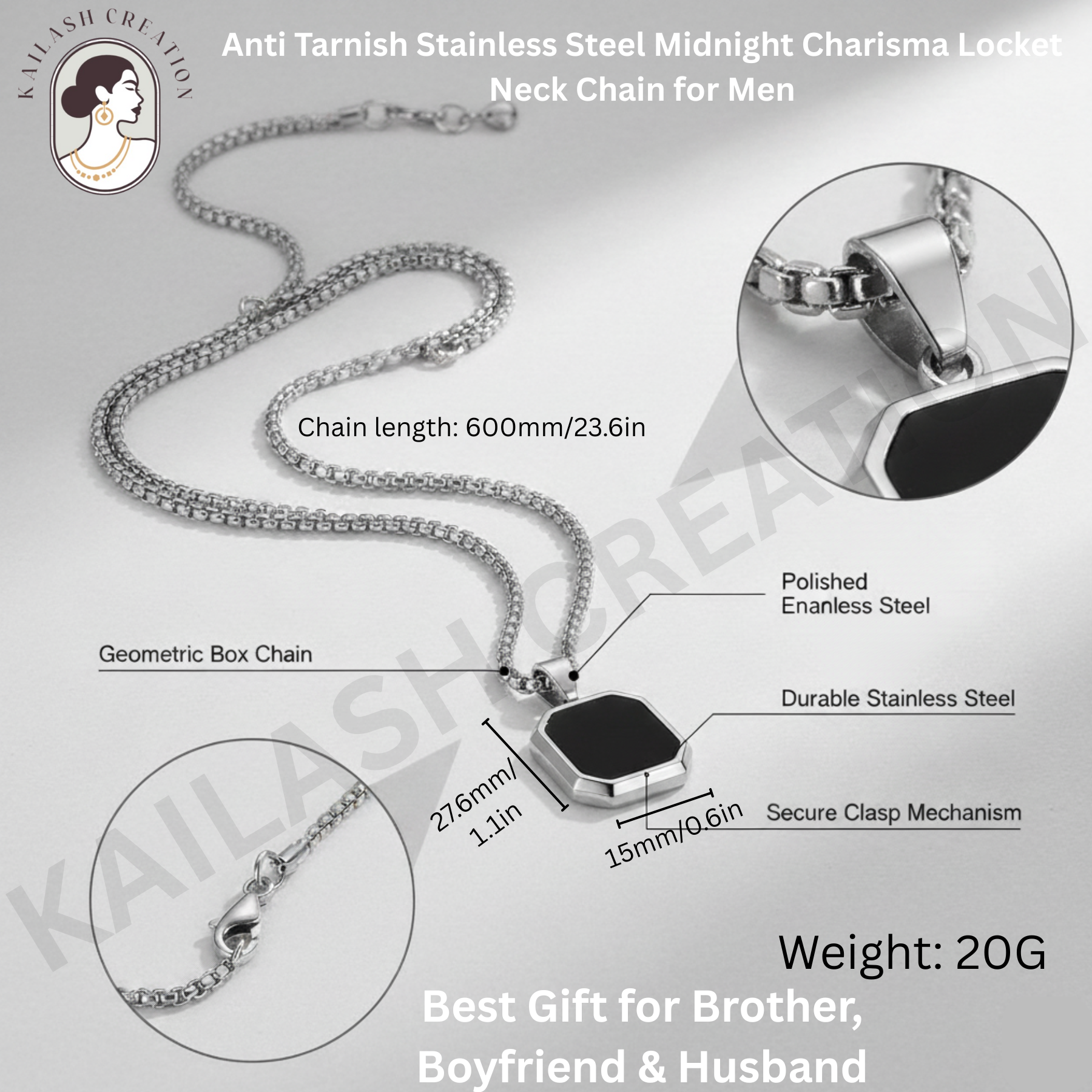 Experience premium style and durability with this stainless steel anti-tarnish locket chain designed for modern men. Featuring a sleek black enamel geometric pendant and a strong box chain, this necklace combines elegance, strength, and everyday comfort.