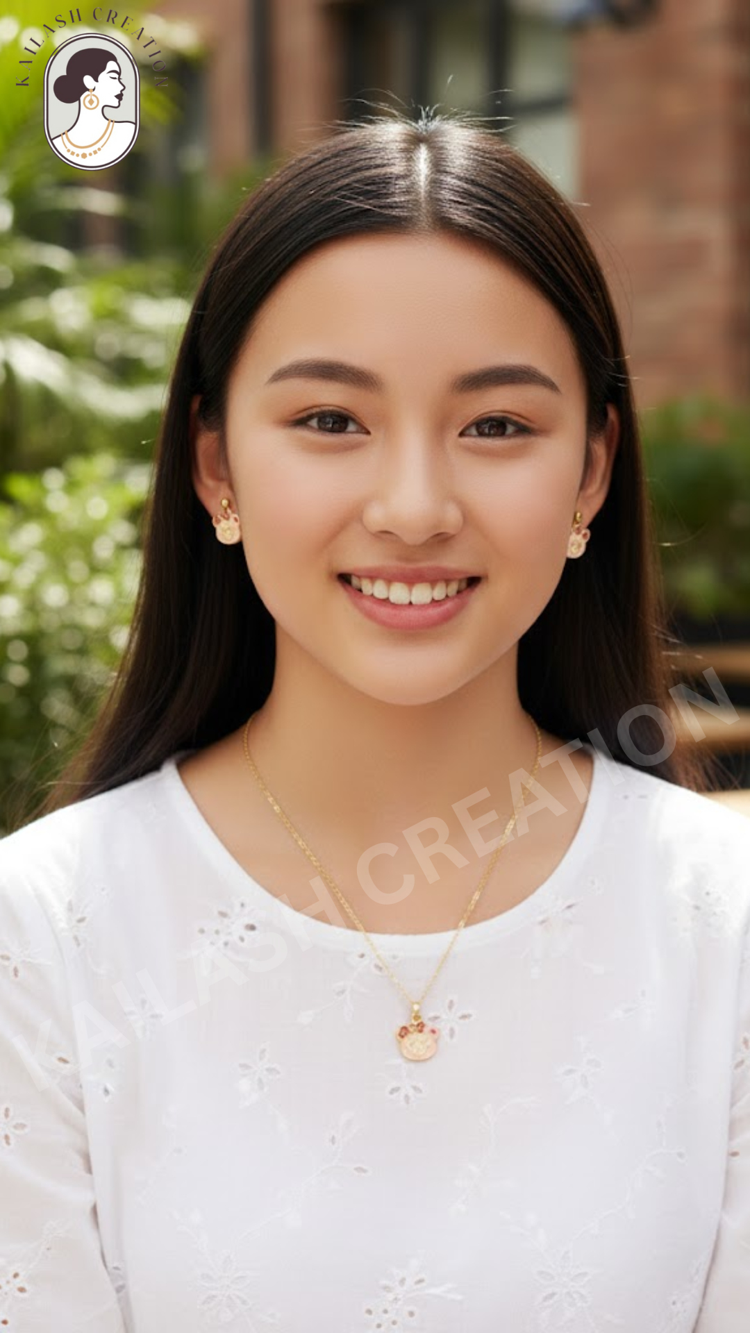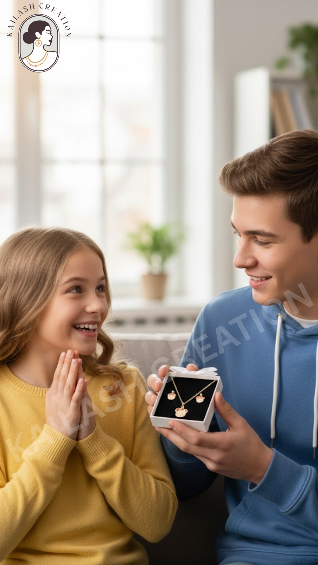 Inspired by childhood joy, this jewelry set captures the essence of innocence and fun. The teddy bear motif with a red bow symbolizes warmth, comfort, and love – making it a beautiful expression of a child's bright personality.