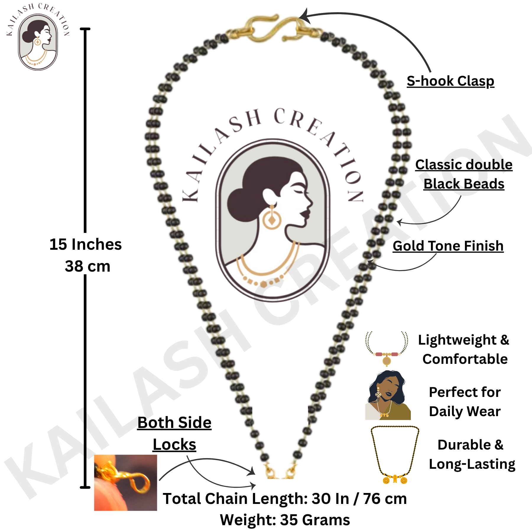 Kailash Creation Gold Plated Pearl Mangalsutra Chain for Women – Black Beads Lariat Style Necklace with with lobster lock and S-Hook Clasp | Traditional Wear Jewelry