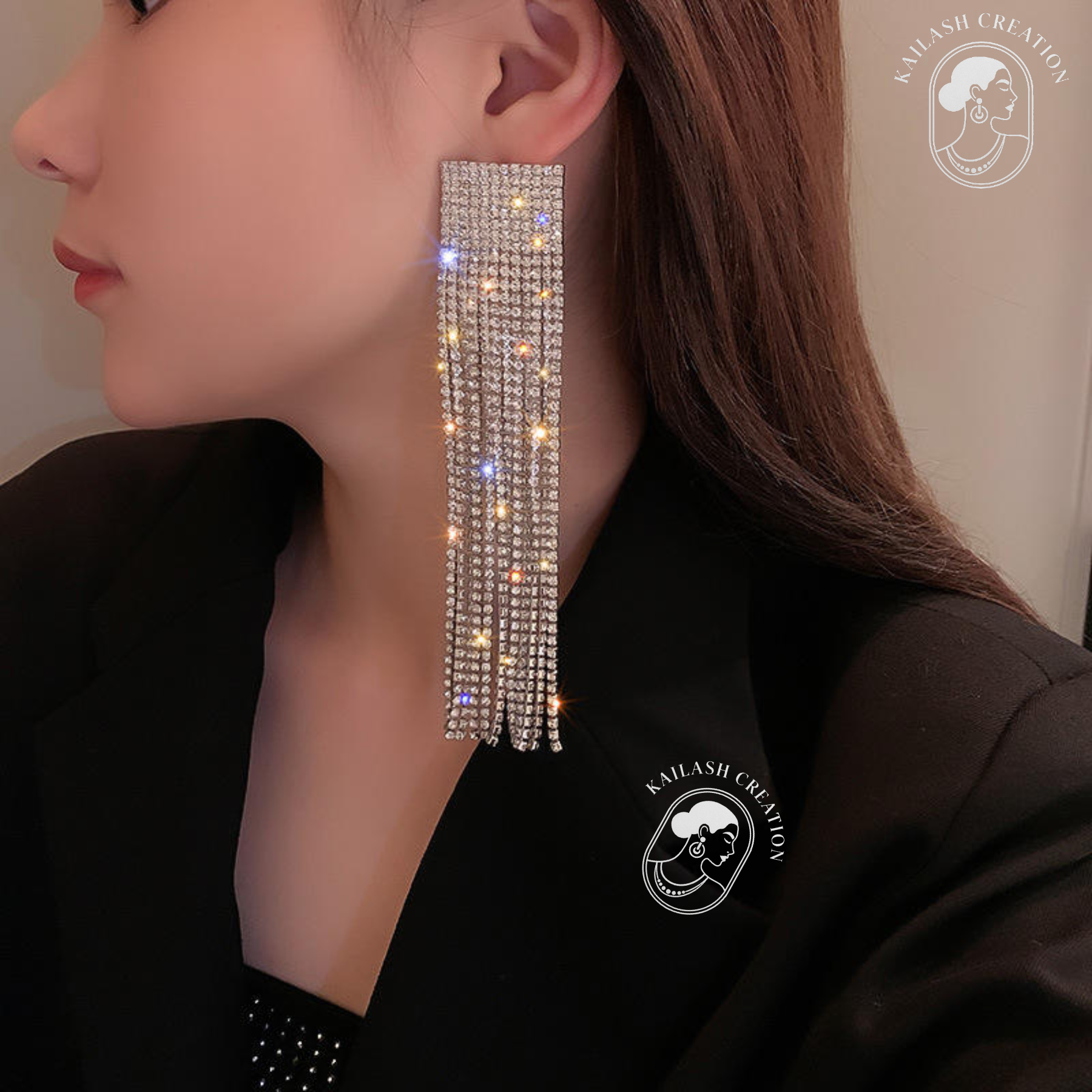 Inspired by chandelier and tassel styles, these earrings combine timeless charm with modern fashion trends. The layered rhinestone chains add depth, while the sparkling crystals give a bold yet elegant statement look.
