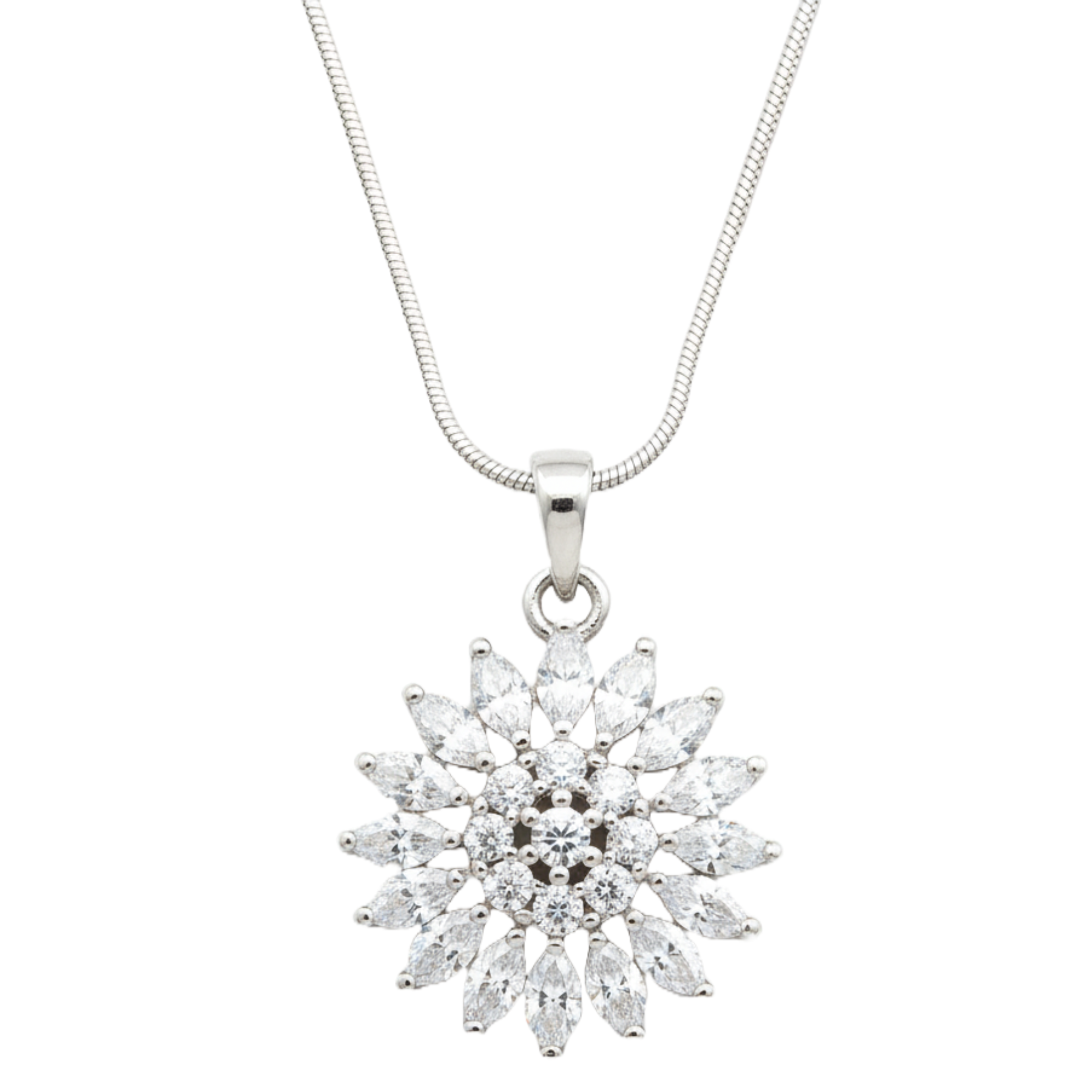 Sunburst Flower CZ Diamond 18 inches Silver Plated Chain Pendant for women and Girls